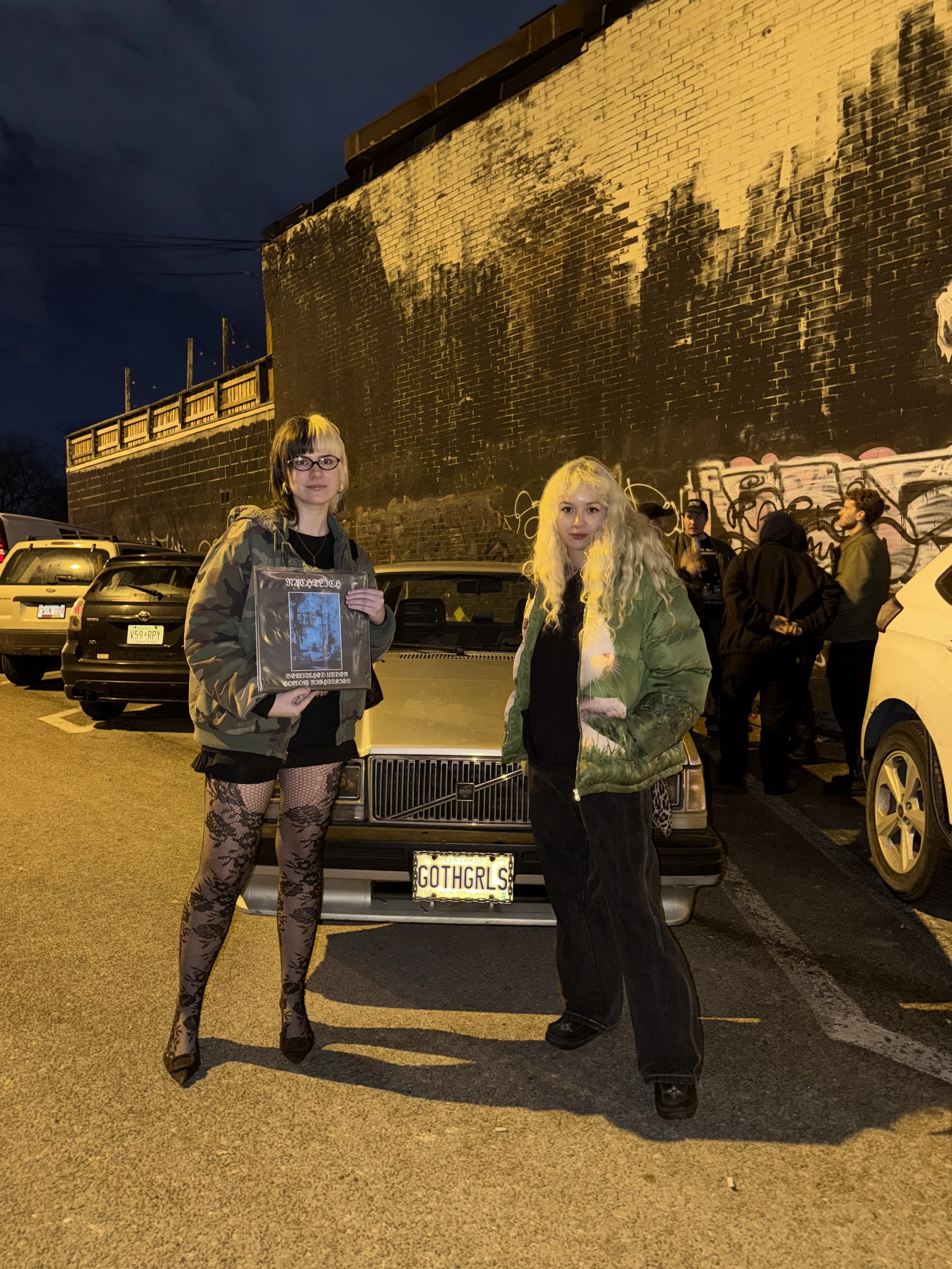 Halfway through the show, Sam texts me to meet him at Cafeteria. I walk over between sets. On my way out, a guy who’s been trying to talk to me all night wants to show Dora and me his custom license plate he bought off Facebook Marketplace. It says “GOTH GRLS.” We make him take a photo of us in front of it.