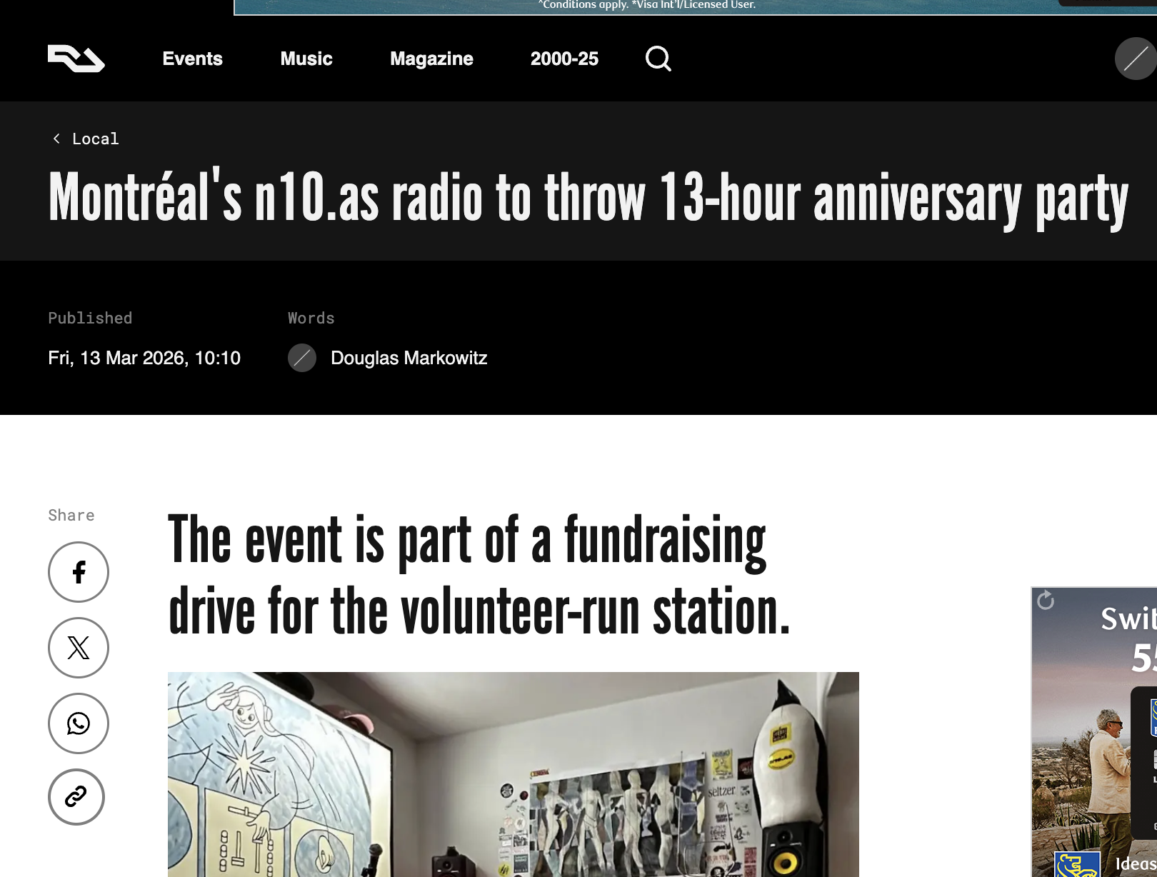 Resident Advisor Montréal's n10.as radio to throw 13-hour anniversary party